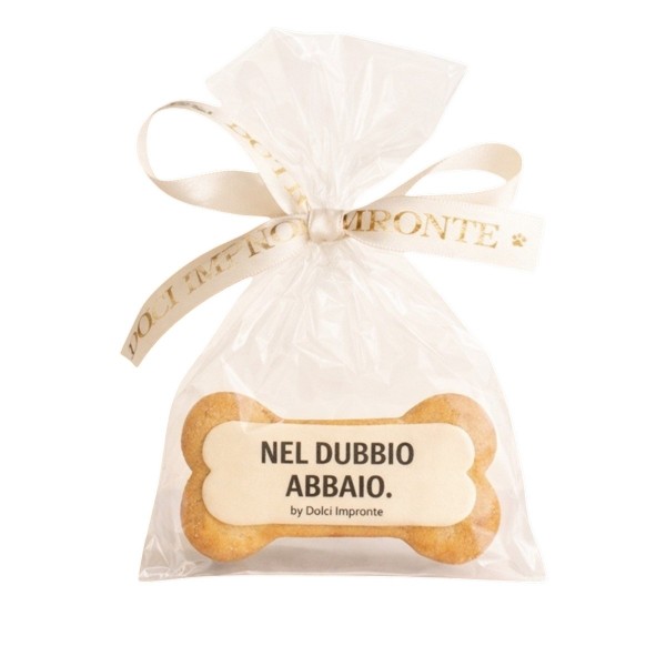 A large, centered biscuit, individually wrapped in a Cristal bag with an ivory Dolci Impronte ribbon.