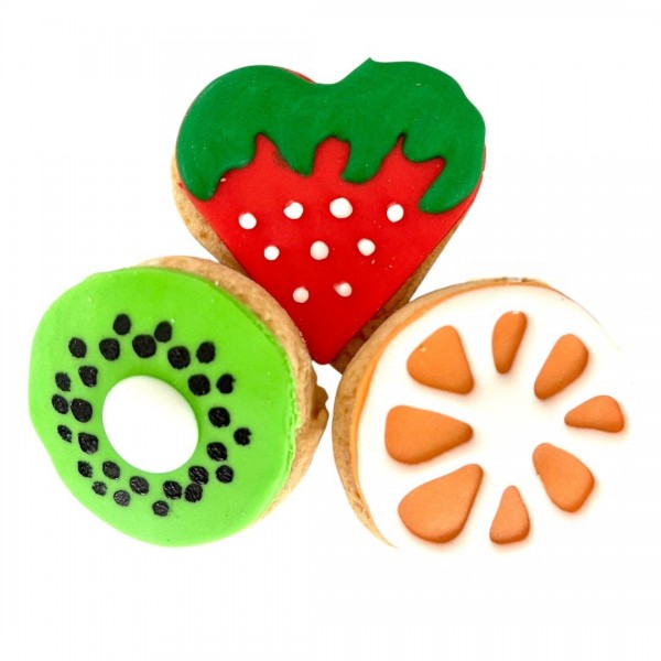 Tray containing 15 crumbly biscuits, fruit-shaped, handmade and finely decorated.