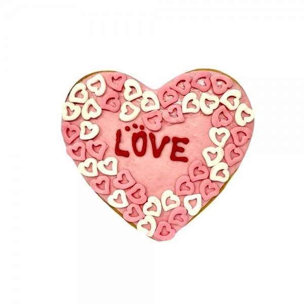 FR : Dolci Impronte | Lot de 3 pièces – Cœur rose et petits cœurs 52g – Biscuit artisanal en forme de cœur avec patte blanche et décorations, env. 8x6 cm, poids net 52 g ; aliment complémentaire pour chiens adultes ; composition : farine de blé tendre, fructose, œufs pasteurisés, margarine végétale, saccharose, sirop de glucose, miel, huiles et graisses...