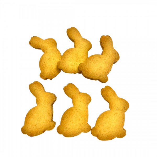 Deliziosi biscottini fatti a mano uno ad uno a forma di coniglietto e aromatizzati alla mela. Composizione: farina (grano tenero), fruttosio, uova pastorizzate, margarina vegetale, miele. Additivi tecnologici: conservanti (sorbato di potassio 1k202, acido sorbico 1a200). Additivo organolettico: aroma, colorante alimentare.