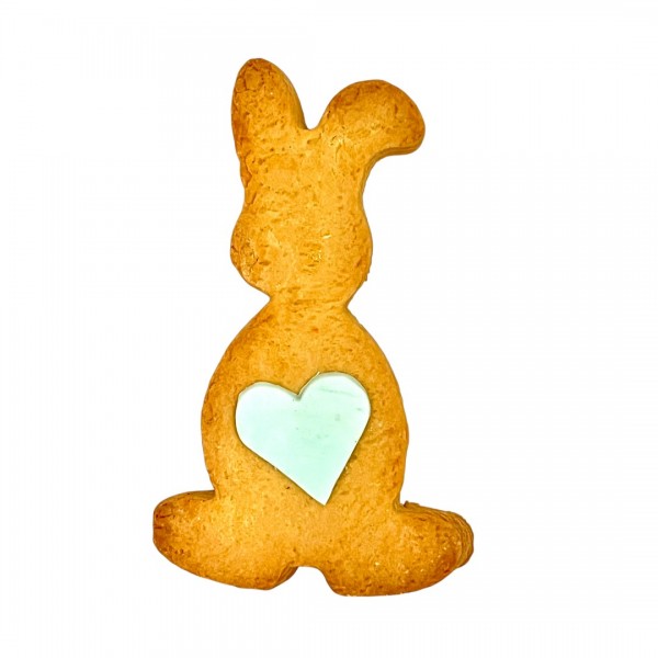 Biscotto in frolla a forma di coniglio, con decorazione applicata a forma di cuore azzurro. Misure 7x12cm